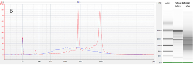 Figure 2 | Overlay of Bioanalyzer traces before and after the Poly(A) RNA Selection Kit was used. The overlay with diluted total RNA clearly demonstrates that those peaks identified as rRNA (top figure) are not rRNA peaks. Red trace: diluted total Universal Human Reference RNA (UHRR), intact (RIN 8.5). Blue trace: poly(A)-selected RNA.