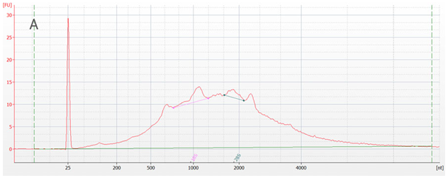 Figure 1 | Bioanalyzer trace after the Poly(A) RNA Selection Kit was used with 5 µg of Universal Human Reference RNA (UHRR). The Bioanalyzer software wrongly classifies two peaks within the trace of the poly(A)-selected sample as 18S and 28S rRNA.