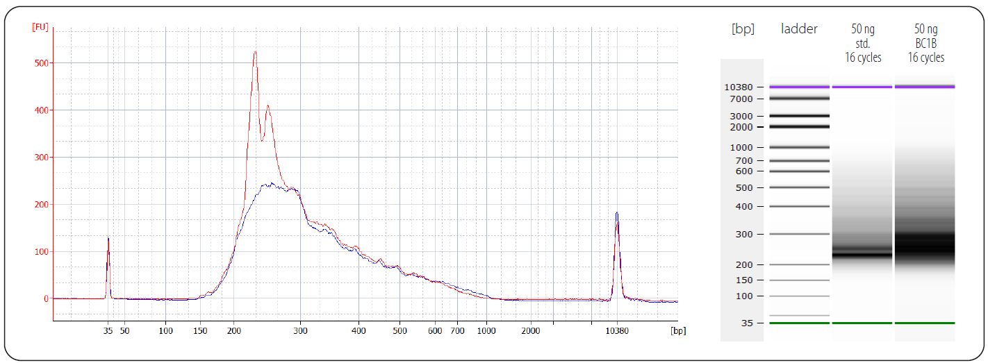 Libraries were prepared from 50 ng of mouse brain RNA with the Standard QuantSeq FWD protocol (RS Standard, red trace), versus QuantSeq with BC1 Block (+RS-BC1B, blue trace). Commercially available mouse brain RNA (BioCat MR-201) was used. Both libraries were amplified with 16 cycles. The two dominant peaks between 230 and 280 bp that are visible in the standard libraries are no longer visible after BC1 blocking.