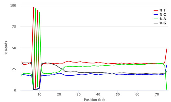 Figure 1 | FastQC Per Base Sequence Content profile for QuantSeq FWD library pool sequenced on NextSeq 500 (no UMIs).