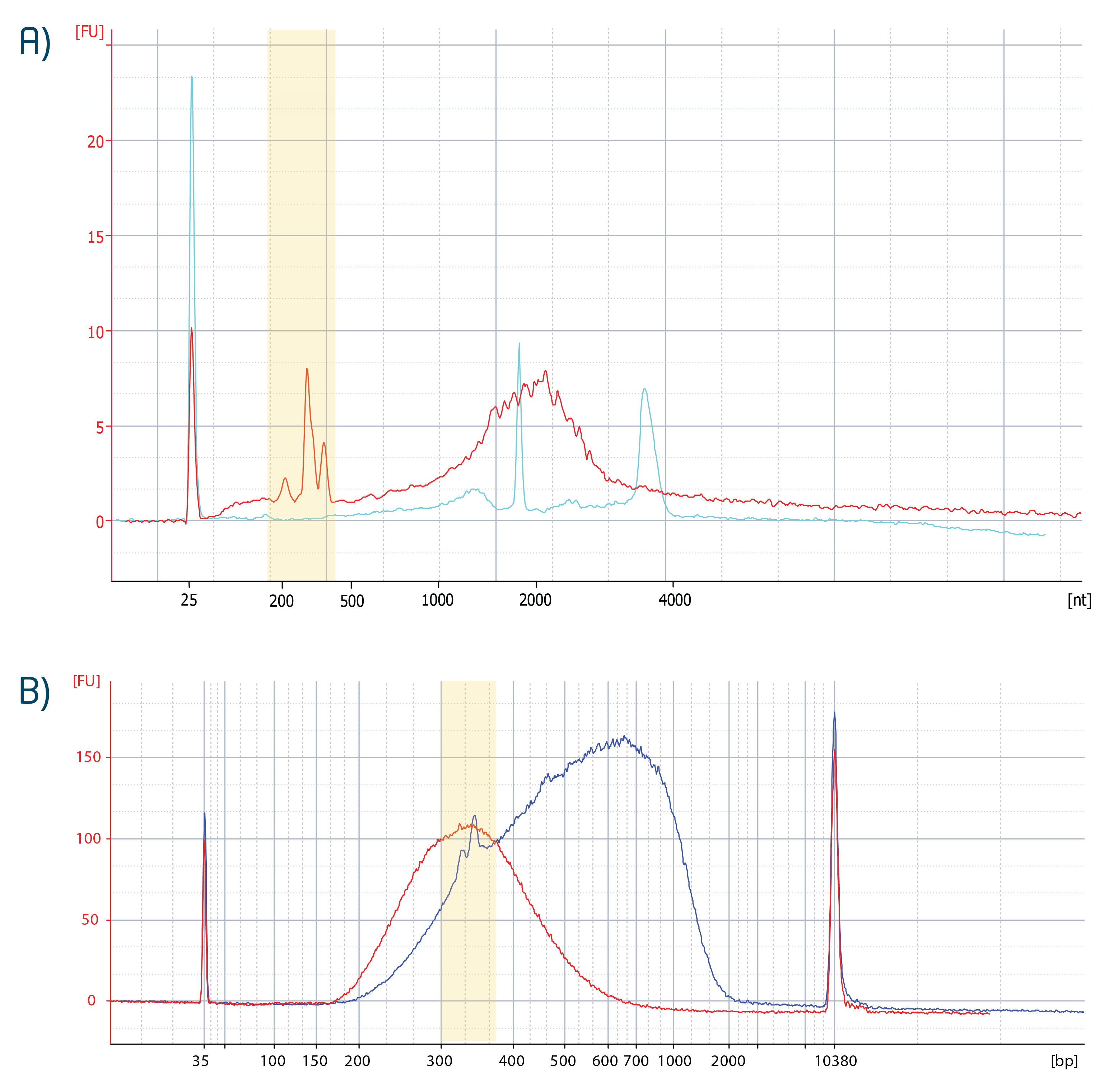 When present in the input RNA (Fig. A), peaks in the library trace directly correspond to these non-coding RNAs (Fig. B). The figures below show representative RNA and library traces generated from human reference RNA (UHRR) following ribo-depletion. Sequencing data quality is not affected by the distinct appearance of these RNAs in the libraries.