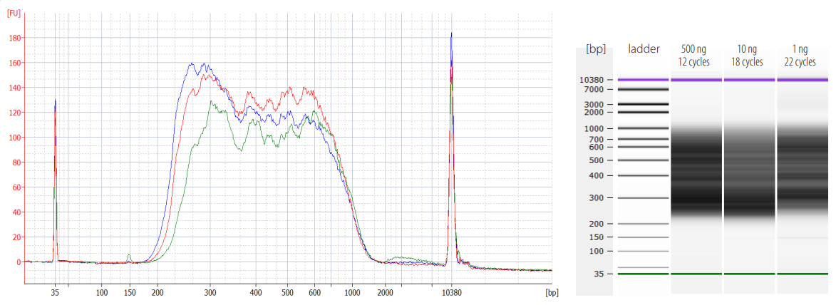 Figure | Bioanalyzer traces of QuantSeq REV V2 libraries prepared from different input amounts of total RNA input (UHRR). Libraries were prepared with the standard protocol, using 500 ng (red trace, 12 PCR cycles) and 10 ng (blue trace, 18 PCR cycles) of UHRR. Libraries with 1 ng (green trace, 22 PCR cycles) of UHRR input were prepared with low input protocol modifications (see User Guide). Endpoint PCR was performed using unique dual indices.
